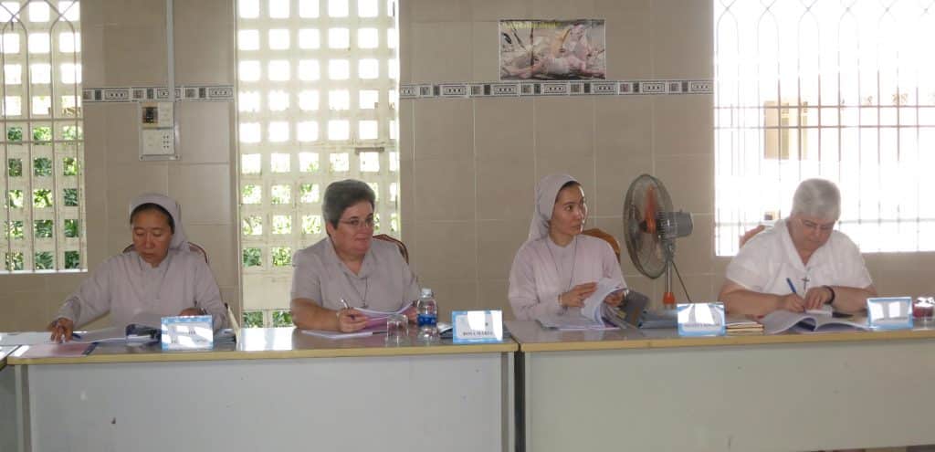 Sor Teresa Mai Thi Thuý Hong, hace un relato breve de la vida y misión de la Delegación desde 2016 a 2018. Agradece a la anterior provincia de Barcelona el apoyo recibido a nivel de recursos humanos y materiales, igualmente la ayuda recibida en estos tres últimos años de la Provincia de España. Con ella, las hermanas del Gobierno de la Delegación presentan los distintos apartados que recogen la actividad realizada a nivel de “Vida y Misión”, respondiendo a la Programación 2016-2018 que han llevado a cabo. La superiora general, sor Anabela Carneiro, agradece a las hermanas del Gobierno el trabajo realizado en estos años; valora la trayectoria histórica recorrida y señala que si hoy estamos aquí es gracias a las hermanas anteriores que desde el inicio han ido trazando un camino, entretejiendo la estructura de la Delegación cada vez más consolidada; finalmente resalta la misión hospitalaria que realizan las hermanas en la dedicación a las personas con enfermedades físicas y psíquicas.