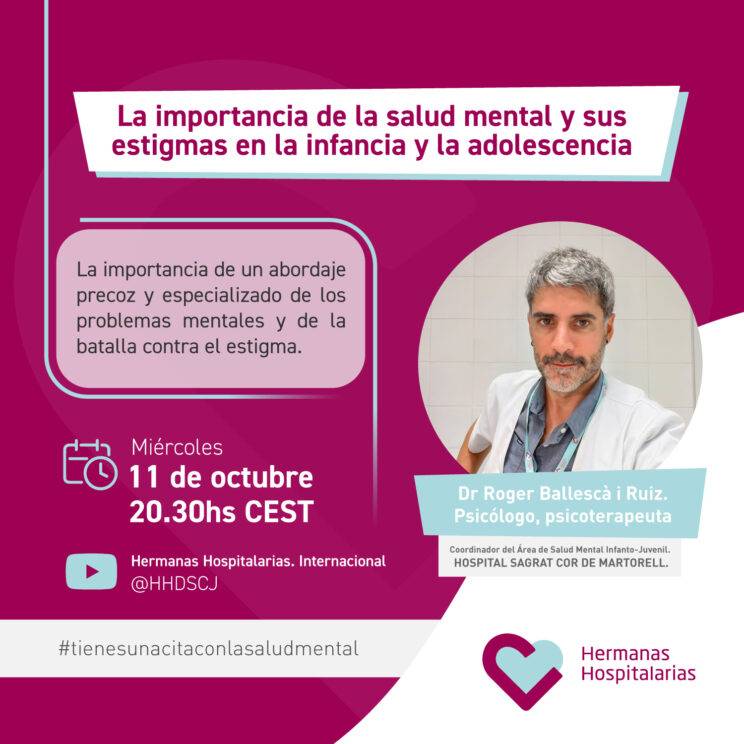 Desde hace 142 años, Hermanas Hospitalarias trabaja para sensibilizar sobre los problemas relacionados con la salud mental y su impacto en la vida de las personas. Su misión es estar al servicio de los pacientes. La necesidad de actuar en relación con la salud mental es indiscutible y urgente. El día Mundial de la Salud Mental es un buen momento para mirar de nuevo a este carisma centenario. Desde la Institución, se ayuda a que más de 820 mil personas con alguna patología de salud mental. Entre las diversas iniciativas que realiza Hermanas Hospitalarias en el mundo, hoy queremos destacar tres. La primera es el trabajo de las hermanas en Telema (kinshasha) en una comunidad de hermanas que, liderada por Sor Ángela Guitérrez, dirigien -desde hace más de 30 años- un Centro que es el principal referente de atención de salud mental en África. En España también destacamos la labor que se realiza en todo lo que tiene que ver con salud mental InfantoJuvenil, nuestros centros de Cataluña atienden a jóvenes y adolescentes que necesitan mejorar su bienestar emocional en un mundo hiperconectado y digitalizado. Sobre este tema, el próximo 11 de octubre, hemos organizado una conferencia a cargo del psicólogo y psicoterapeuta Roger Ballescà i Ruiz, coordinador del Área de Salud Mental Infanto-Juvenil en el Hospital Sagrat Cor de Martorell de Hermanas Hospitalarias. ????️ Miércoles 11 de octubre ???? 20.30 hs CEST (Roma) A través de nuestro canal de YouTube ???? https://www.youtube.com/@HHDSCJ