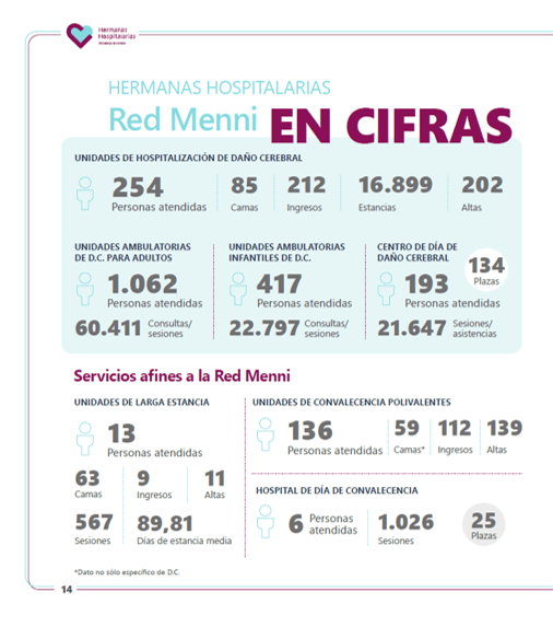 Hay mucha vida tras un daño cerebral. Y sabemos muy bien que la rehabilitación añade calidad a esa vida, que una atención integral, continuada e individualizada a la persona con daño cerebral aumenta las posibilidades de rehabilitación de las capacidades perdidas, de su inclusión y participación en la sociedad. https://youtu.be/hEq1gVEkEC0 Por ello, un año más, y se cumplen 30 desde la inauguración de nuestro primer Servicio de Daño Cerebral, alrededor del día 26 de octubre, en la Red Menni de Daño Cerebral en su conjunto, y en cada uno de los centros de atención de Madrid, País Vasco, Cantabria, Castilla y León, Comunidad Valenciana y Canarias, Comunidades donde Hermanas Hospitalarias dispone de equipos multidisciplinares especializados e instalaciones, organizamos distintas actividades junto con personas afectadas y familias para celebrar el Día del Daño Cerebral. El objetivo: poner de relieve las necesidades de atención integral que precisan quienes han sufrido una lesión cerebral y las personas de su entorno más cercano. Este año 2022, además de las salidas a la comunidad y la lectura del manifiesto del movimiento asociativo reunido en trono a FEDACE, entre los programas de celebración del Día del Daño Cerebral en nuestros distintos centros destacan: