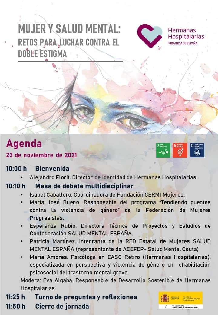 El próximo martes 23 de noviembre, de 10 a 12 horas, Hermanas Hospitalarias organiza la Jornada on line Mujer y salud mental: retos para luchar contra el doble estigma, en el marco del proyecto de sensibilización antiestigma Vive y convive, financiado por el Ministerio de Derechos Sociales y Agenda 2030.El objetivo de la jornada es reflexionar sobre el doble estigma al que se enfrentan las mujeres con problemas de salud